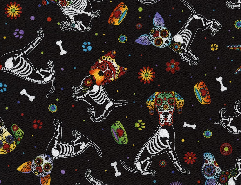 Animals Bright Day of the Dead Dogs Candy Skull Skeletons on Black Fabric Unisex Medical Surgical Scrub Caps Men & Women Tie Back and Bouffant Hat Styles