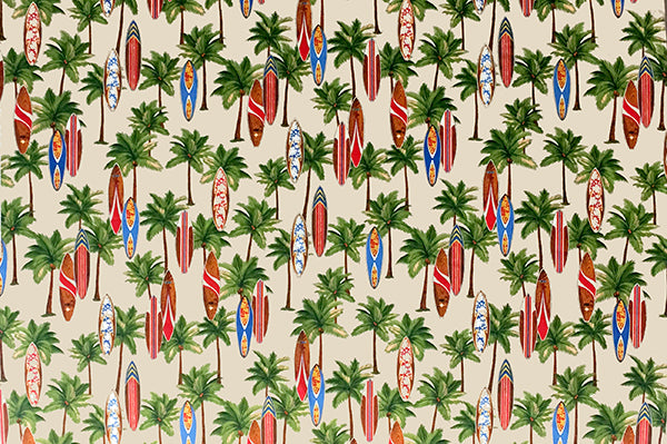 Hawaiian Tropical Palm Trees & Surfboards on Tan Fabric Unisex Medical Surgical Scrub Caps Men & Women Tie Back and Bouffant Hat Styles