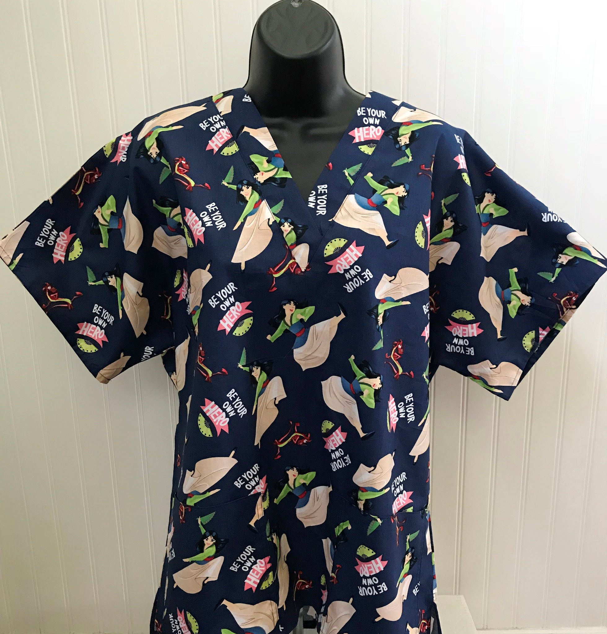 Mulan Be Your Own Hero Blue Fabric Nurse Medical Scrub Top Unisex Style for Men & Women