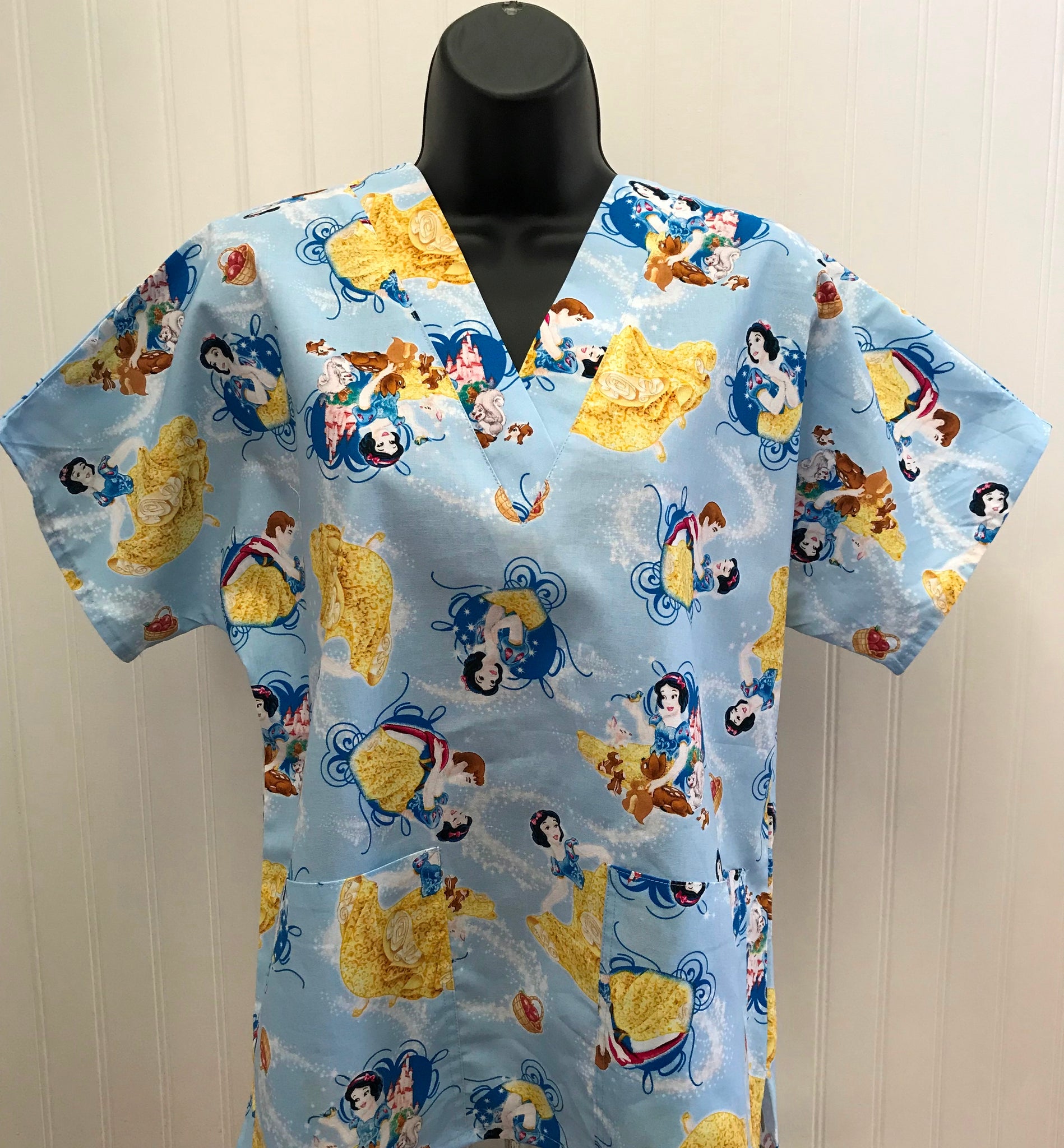 Snow White with Prince Charming Blue Fabric Nurse Medical Scrub Top Unisex Style for Men & Women