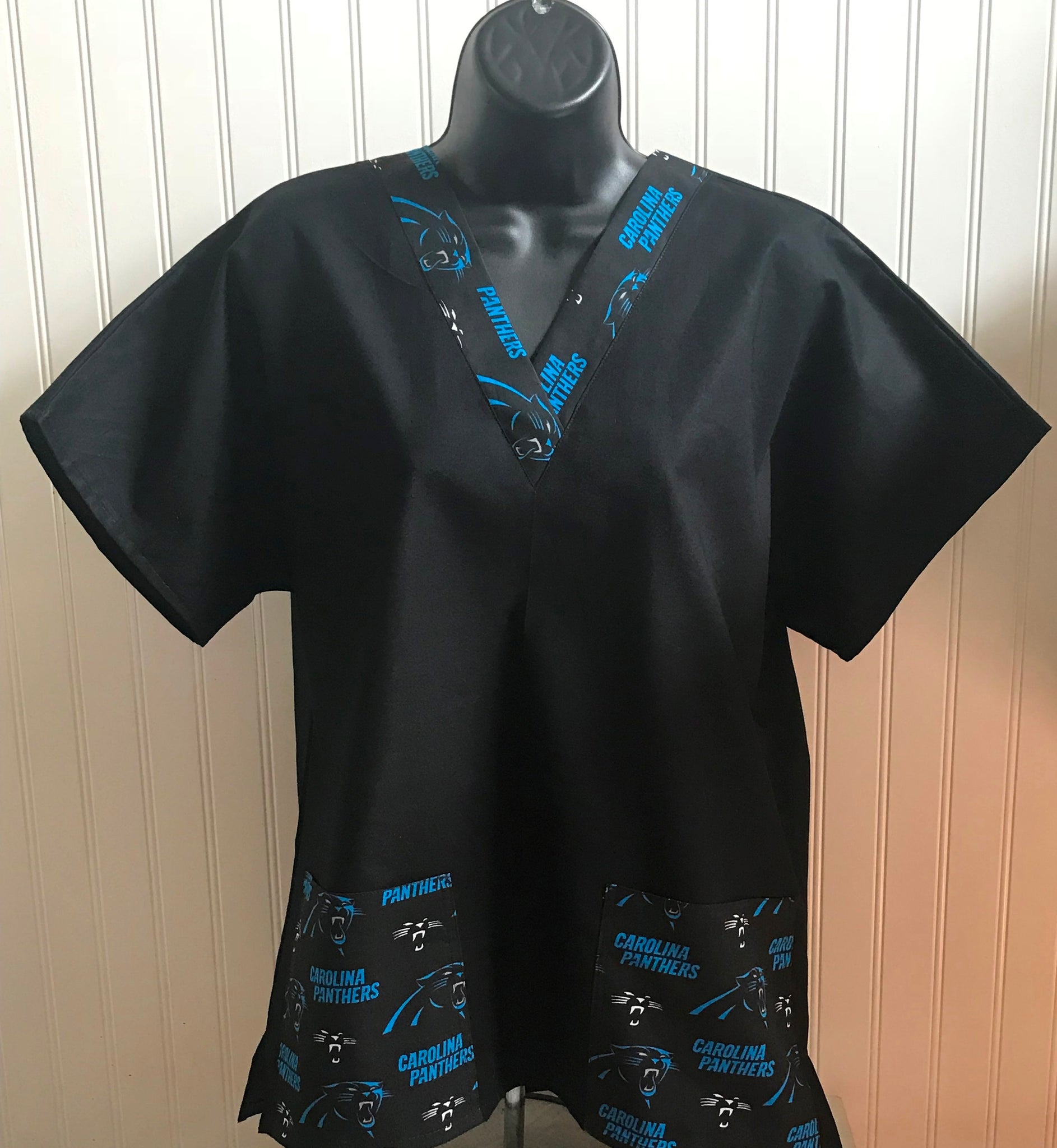 Solid Medical Scrub top with Panthers fabric is handmade from 100% cotton, a relaxed fit, not fitted, V-neck, short sleeved with choice of No Pockets, 2 roomy double stitched front pockets OR 1 Chest Pocket with hip side slits for extra hip ease or the No Slits Option. All seams have zigzag edges to prevent fraying. I suggest machine wash cold, hang dry, light ironing maybe required. Will shrink if washed in hot water and placed in dryer.